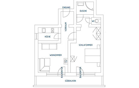 1 Schlafzimmer mit Dusche, WC separat, Wohnraum mit Couch und Essecke, TV, Radio, Küche (Kaffeemaschine, Mikrowelle, Spülmaschine, Wasserkocher, Toaster), Südbalkon