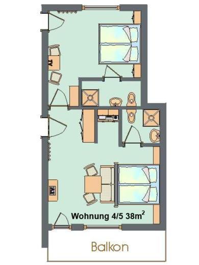 Dieses Apartment für 2 - 3 Pers. 38m² ausgestattet mit einem Wohnschlafraum, ein Schlafraum, Kochnische mit Ceranfeld, Wasserkocher, Kaffeemaschine, DU/WC, Fön, Tresor, LCD-TV, Telefon, schnelles Internet (Glasfaser) W- Lan, Südbalkon ideal für Sonnenverliebte.<br>